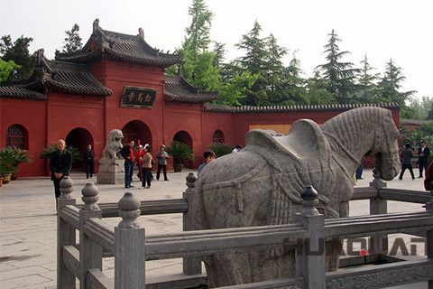 古都洛陽古跡多。游洛陽,不可不游白馬寺,因為它是中國 早的佛寺,被尊為“釋源”和“祖庭”。從洛陽東行十二公里即到白馬寺。但見紅墻綠樹,莊嚴古雅;殿塔臺閣,巍峨肅穆。唐代詩人王昌齡曾宿白馬寺并有詩云:“月明見古寺,林外登高樓。南風開長廊,夏夜如涼秋。”景貌清幽,令人嚮往。我們到達時,寺前廣場一群僧人正在做法事。山門外側有石馬塑像,轡鞍俱備,神態安詳,據說是北宋遺物。