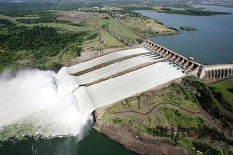 伊泰普大壩建在流經巴西和巴拉圭兩國交界的巴拉那河上,全長7744米,高196米。自上世紀70年代兩次電力能源危機后,巴西政府決定同巴拉圭政府聯合建造當時世界上的水電站。大壩于1975年10月開始建造,直到1982年才竣工,共耗資200億美元。大壩壩后的水庫沿河延伸達161千米,形成深250米、面積達1350平方公里、總蓄水量為290億立方米的人工湖。自1990年改進以后,伊泰普水電站18臺水輪機組發電量高達1260萬千瓦。